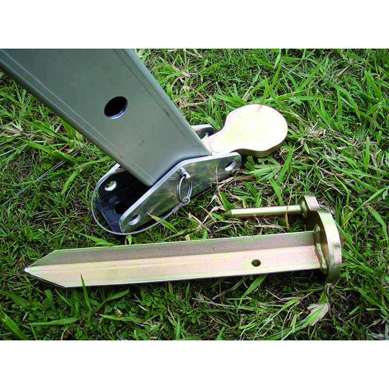 A hold down stake can be used to secure a standard foot to the ground. The foot locating spike lines up with one of the holes in a standard foot. Taking care not to impact against the Arachnipod foot or leg, hammer the hold down stake half way into the ground. Check the alignment of the foot locating spike then continue to hammer the stake into the ground. A soft faced or shot filled hammer is recommended for this task